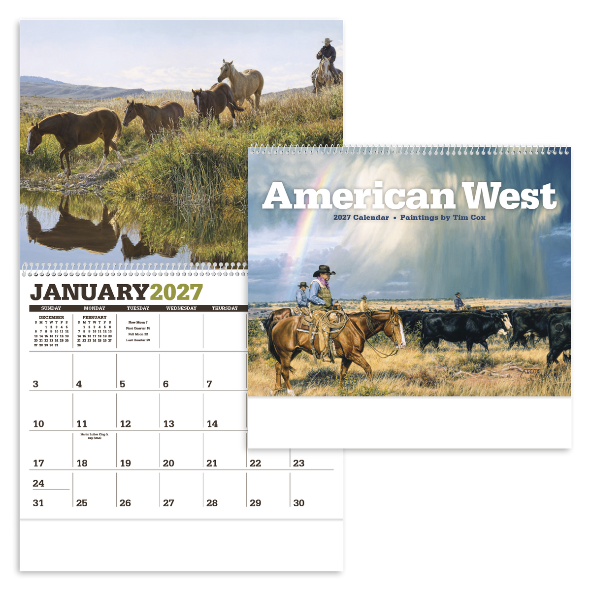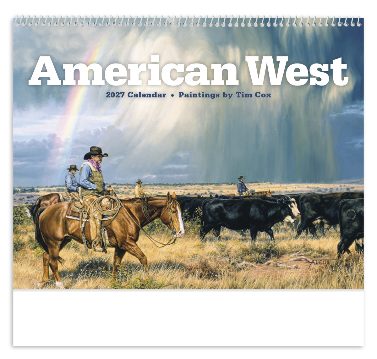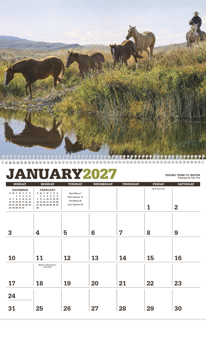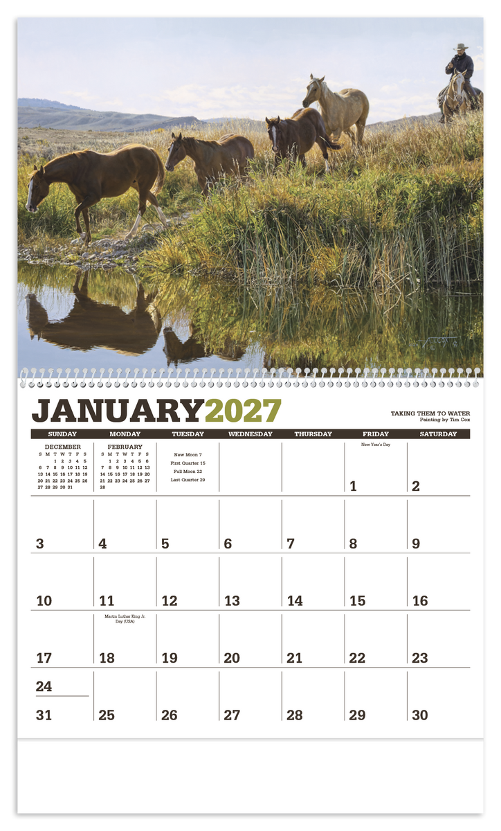 Renowned artist Tim Cox brings the American West to life in this calendar. His life-like depictions of the contemporary cowboy hang in museums across the United States and can now hang in your office or home. The FSC® label means that the materials used for this product come from well-managed FSC®-certified forests and other controlled sources.