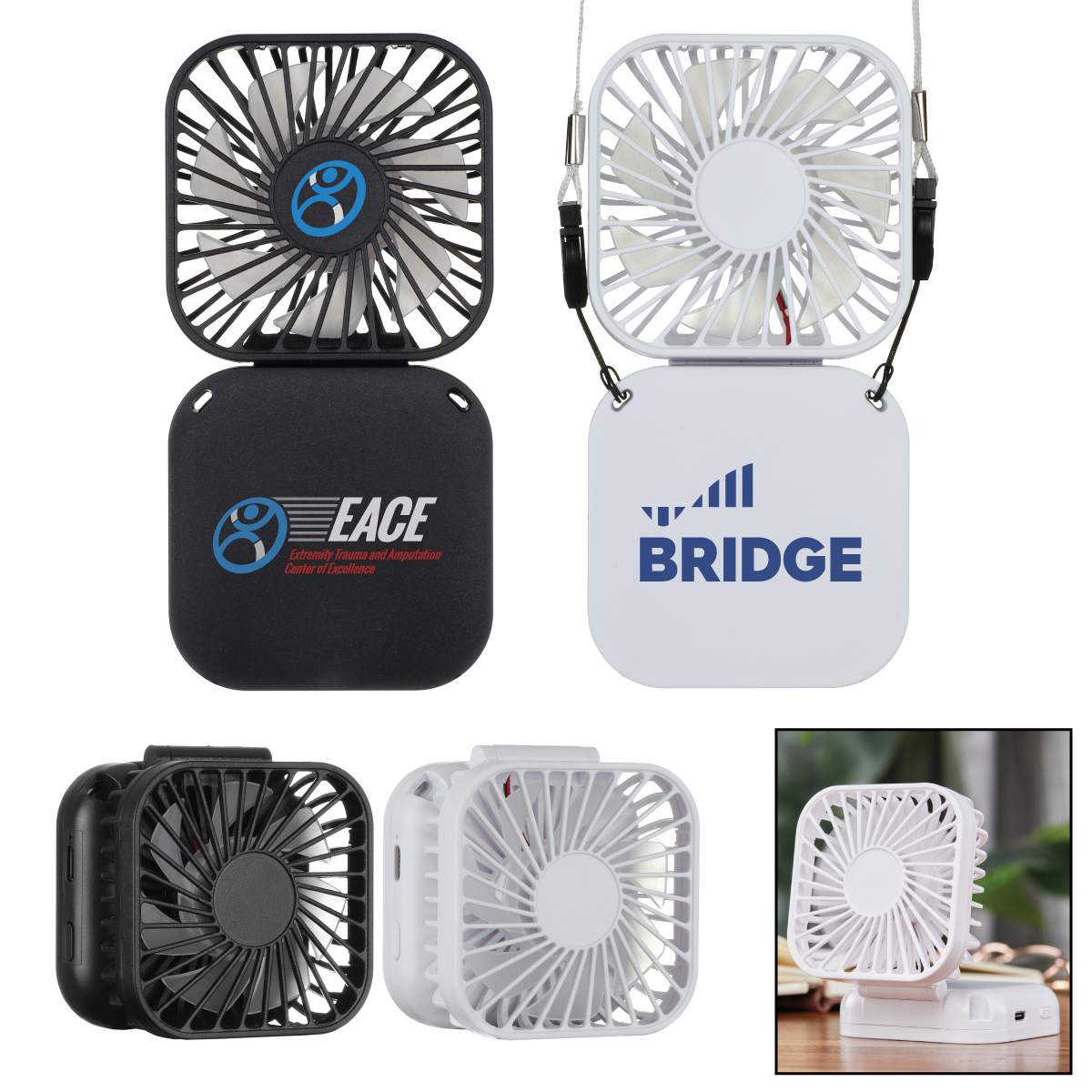 Cool off with this portable and rechargeable mini USB fan that doubles as a neck fan or desktop fan. Includes lanyard to hang around neck for handsfree use. Brushless motor creates a powerful cooling breeze to combat scorching hot days. Press button for 3 different fan speeds. Fold for compact storage or for use as a standing desk fan. Perfect for any indoor or outdoor event. Features a durable plastic housing and high speed fan motor. Includes a USB cable to power the wireless charger. Plug it into any USB powered port.